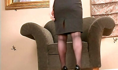 Mature glasses wearing redhead in stockings