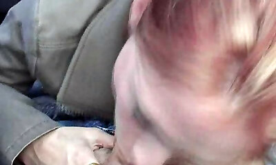 Mature wife gives good suck to man on car