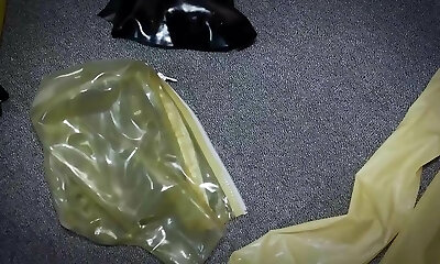 Crossdresser toying with wife in Plastic and PVC